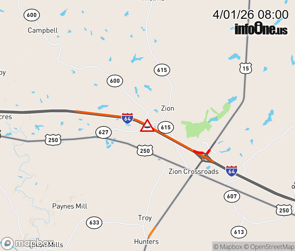 On I-64 West at mile marker 136.4 in the County of Louisa, motorists can expect delays due to a multi-vehicle crash. Updated: Wed 4/1/26 9:44 AM EDT ![]() |
