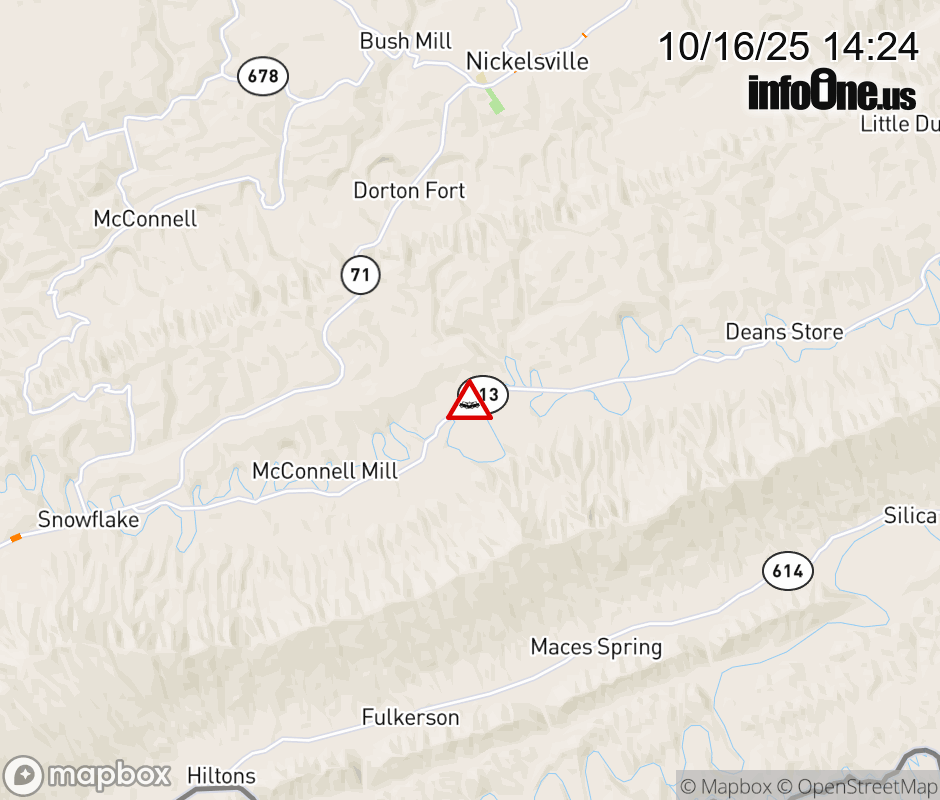 On Rt. 613 East in the County of Scott, in the vicinity of Corn Ridge Ln; Ferguson Bridge Ln; Rt. 688N/S (Scott County), motorists can expect delays due to a vehicle crash. Lane closures exist. ![]() |