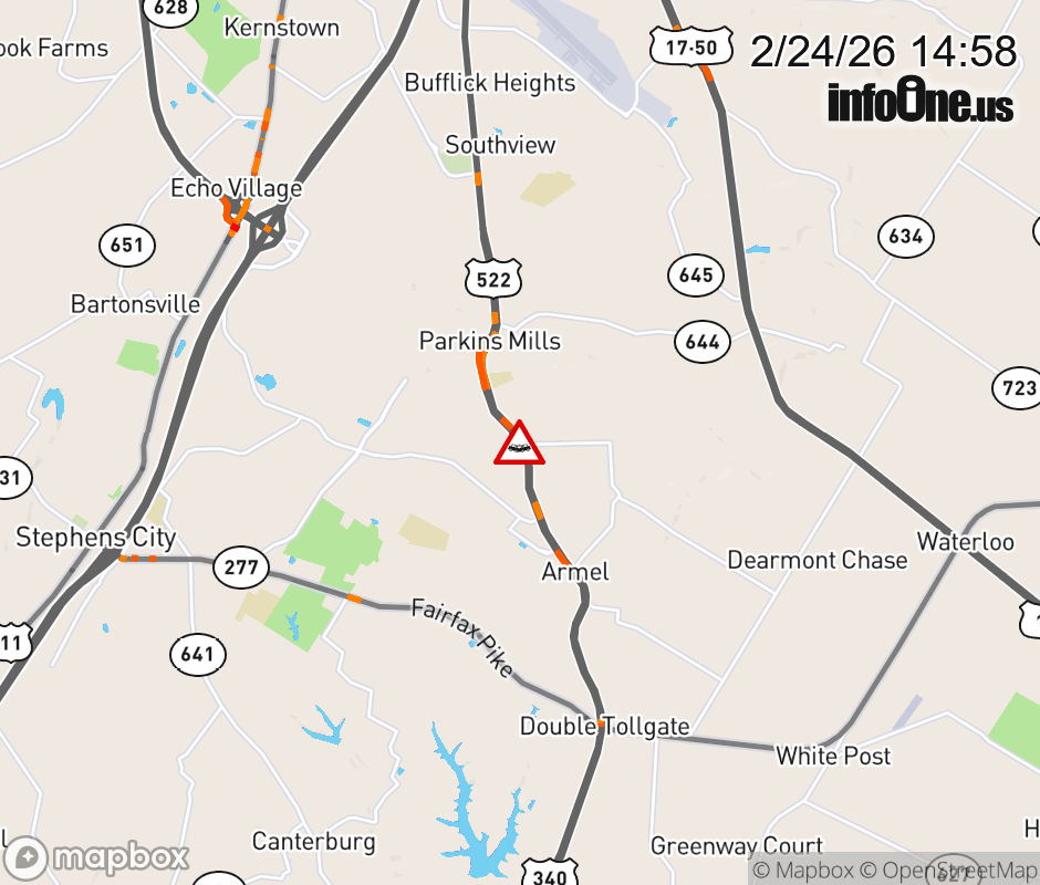 On US-522 in the County of Frederick, in the vicinity of Armel Rd; Tasker Rd; Rt. 642N/S (Frederick County), motorists can expect delays due to a tractor trailer crash. All north lanes are closed. The south left shoulder and left lane are closed. Updated: Tue 2/24/26 2:58 PM EST ![]() Updated: Tue 2/24/26 2:58 PM EST |