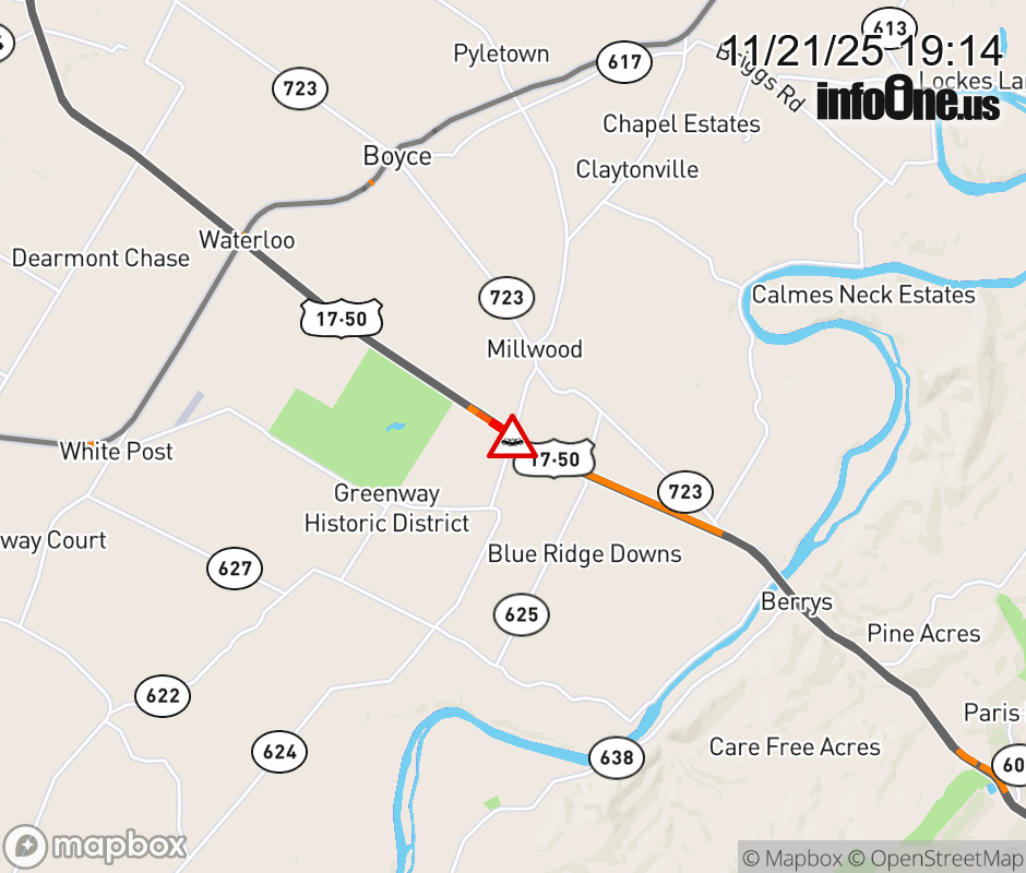 On US-50 in the County of Clarke, in the vicinity of Red Gate Rd; Xovr; Rt. 624N/S (Clarke County); VA-255N/S, motorists can expect delays due to a multi-vehicle crash. The east right lane and right shoulder are closed. ![]() |