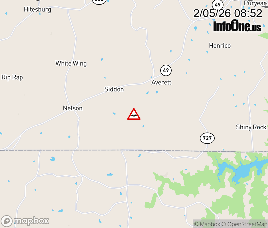 On Rt. 738 North in the County of Mecklenburg, in the vicinity of Willards Mill Rd; Rt. 604N/S (Mecklenburg County), motorists can expect delays due to a vehicle crash. Updated: Thu 2/5/26 8:52 AM EST ![]() Updated: Thu 2/5/26 8:52 AM EST |