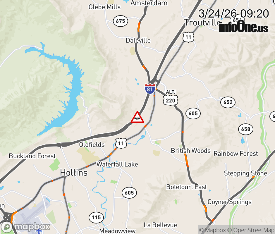 On I-81 at mile marker 149.2 in the County of Botetourt, motorists can expect delays due to a vehicle crash. The north right shoulder is closed. Updated: Tue 3/24/26 9:20 AM EDT ![]() Updated: Tue 3/24/26 9:20 AM EDT |