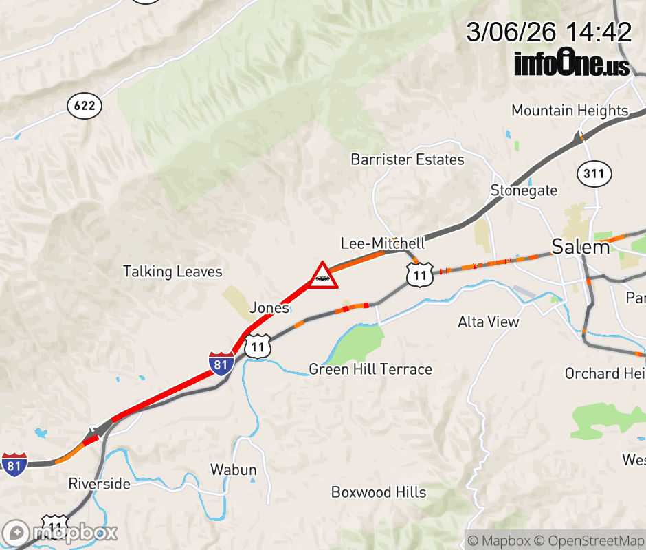 On I-81 at mile marker 136 in the County of Roanoke, motorists can expect delays due to a multi-vehicle crash. The north left shoulder and left lane are closed. Updated: Fri 3/6/26 2:42 PM EST ![]() Updated: Fri 3/6/26 2:42 PM EST |