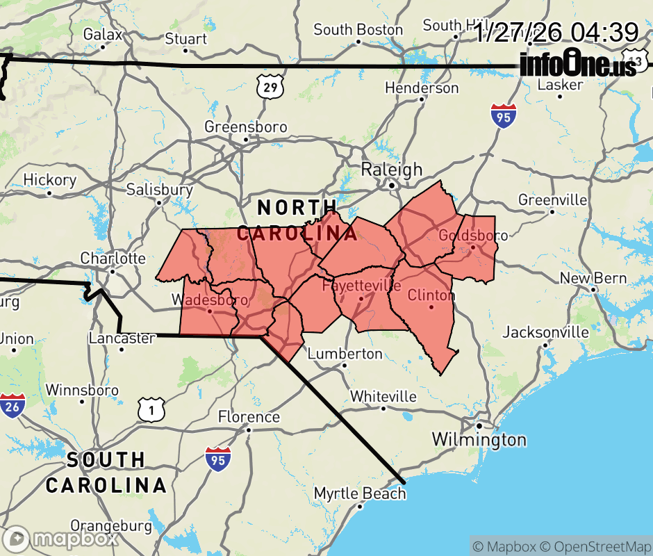 Canceled 1/27/26 9:59 AM Cold Weather Advisory issued January 27 at 4:38AM EST until January 27 at 10:00AM EST by NWS Raleigh NC * WHAT... Very cold wind chills in the single digits above zero. * WHERE... The southern Piedmont, Sandhills, and southern and central Coastal Plain. * WHEN... Until 10 AM EST this morning. * IMPACTS... Very cold temperatures can lead to hypothermia with prolonged exposure. ![]() |