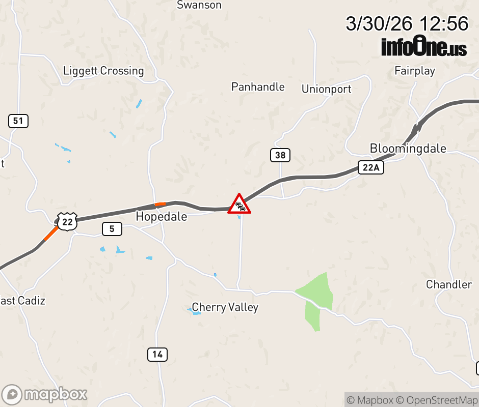 US-22 CLOSED in BOTH DIRECTIONS from County Line Rd to 0.2 miles beyond SR-151/Jewett Hopedale Rd (MM: 25.2), due to police incident. Use alternate route. ![]() |