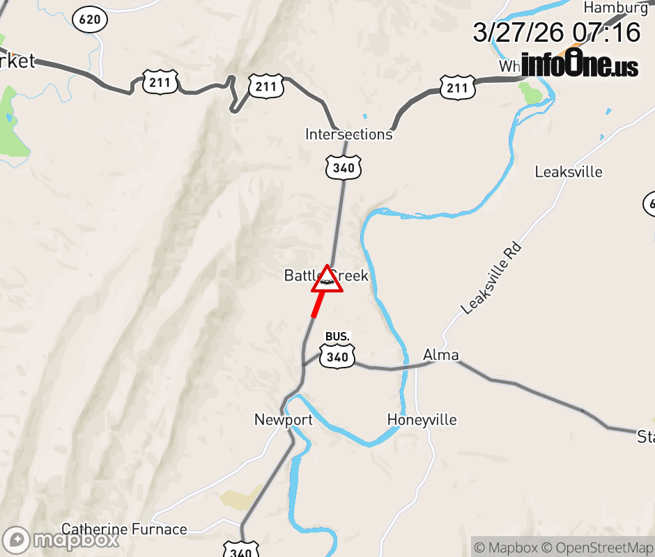 On US-340 North in the County of Page, in the vicinity of Battlecreek Rd; Shuler Ln; Rt. 615N/S (Page County); Rt. 614N/S (Page County), motorists can expect delays due to a vehicle crash. Lane closures exist. Updated: Fri 3/27/26 7:16 AM EDT ![]() Updated: Fri 3/27/26 7:16 AM EDT |