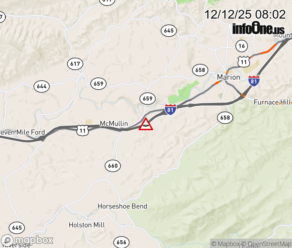On I-81 at mile marker 42.6 in the County of Smyth, motorists can expect delays due to a tractor trailer crash. The south left shoulder, left lane, and right shoulder are closed. Updated: Fri 12/12/25 8:02 AM EST ![]() Updated: Fri 12/12/25 8:02 AM EST |