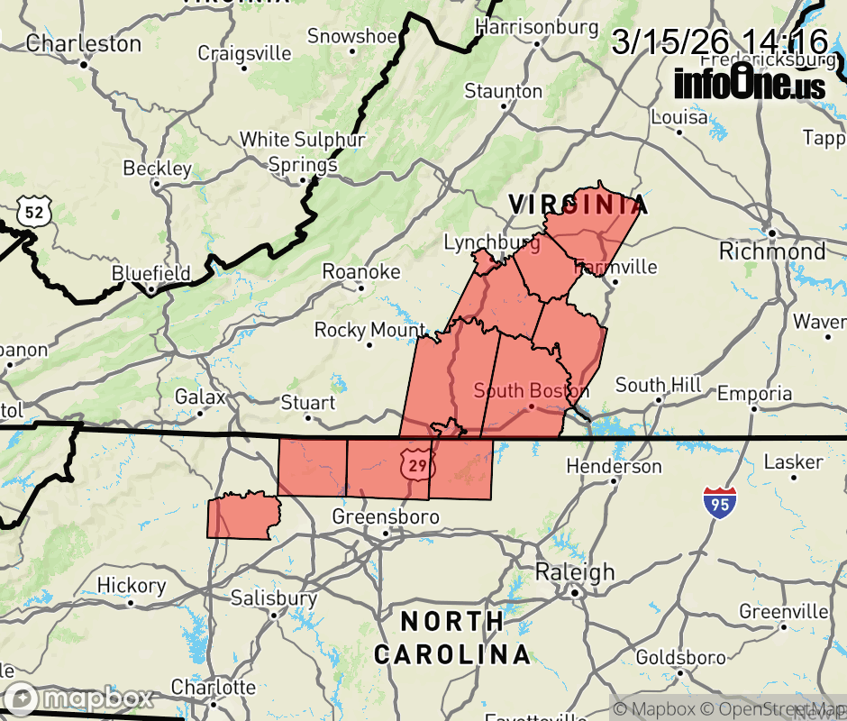 Canceled 3/15/26 9:07 PM Wind Advisory issued March 15 at 2:14PM EDT until March 17 at 12:00AM EDT by NWS Blacksburg VA * WHAT... Southwest winds 15 to 25 mph with gusts up to 45 mph expected. * WHERE... In North Carolina, Caswell, Rockingham, Stokes, and Yadkin Counties. In Virginia, Appomattox, Buckingham, Campbell, Charlotte, Halifax, and Pittsylvania Counties. * WHEN... From 11 AM Monday to midnight EDT Monday Night. * IMPACTS... Gusty winds will blow around unsecured objects. Tree limbs could be blown down and a few power outages may result. ![]() |