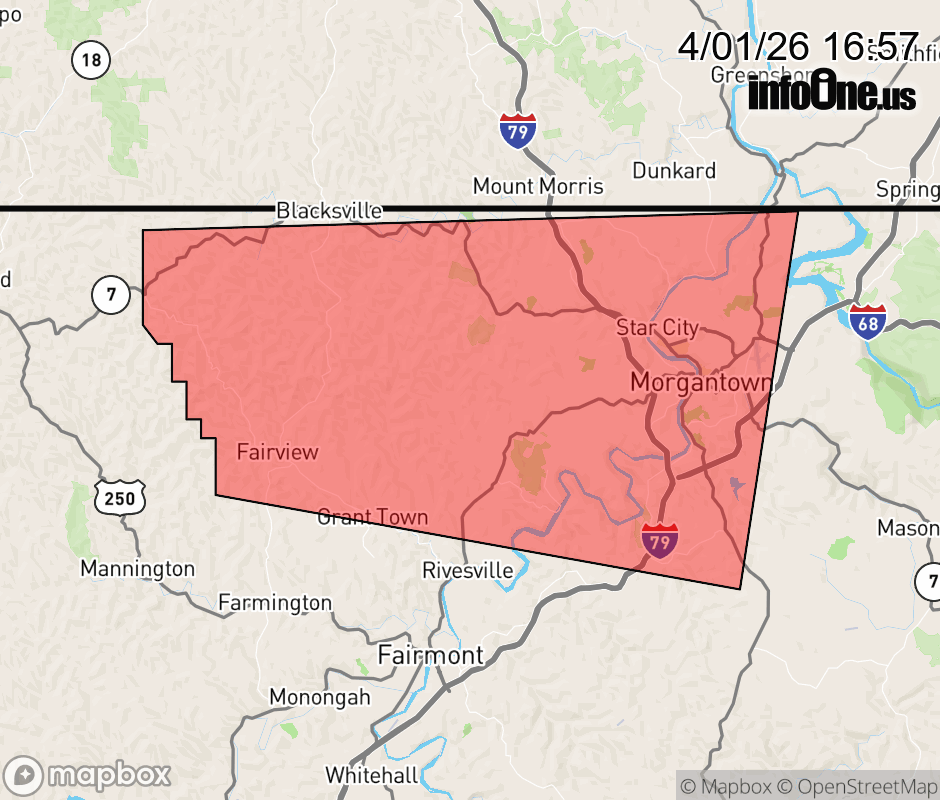 Canceled 4/1/26 5:08 PM Severe Thunderstorm Warning issued April 1 at 4:55PM EDT until April 1 at 5:30PM EDT by NWS Pittsburgh PA At 455 PM EDT, a severe thunderstorm was located near Fairview, or 10 miles northeast of Mannington, moving east at 30 mph. HAZARD...60 mph wind gusts and quarter size hail. SOURCE...Radar indicated. IMPACT...Hail damage to vehicles is expected. Expect wind damage to roofs, siding, and trees. Locations impacted include... Morgantown, Westover, Star City, Granville, Fairview, Cassville, Grant Town, Georgetown, Core, Crown, McCurdyville, Everettville, Booth, Osage, Pentress, Daybrook, Wana and Wadestown. ![]() |