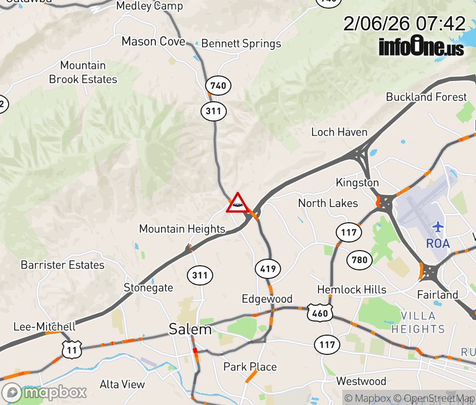 On VA-419 in the County of Roanoke, in the vicinity of Dutch Oven Rd; Rt. 863N/S (Roanoke County), motorists can expect delays due to a vehicle crash. The south right lane and right shoulder are closed. The south entrance ramp narrows. ![]() |