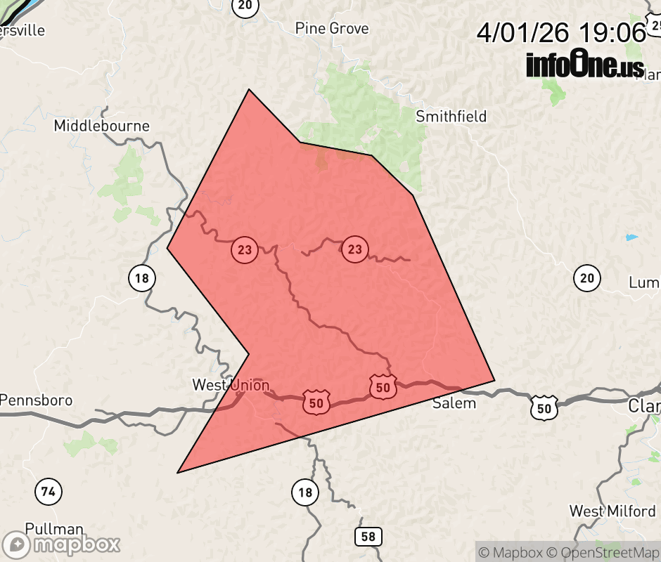 Canceled 4/1/26 7:15 PM Severe Thunderstorm Warning issued April 1 at 7:05PM EDT until April 1 at 7:15PM EDT by NWS Charleston WV At 704 PM EDT, a severe thunderstorm was located 7 miles northwest of Salem, or 16 miles southeast of Middlebourne, moving northeast at 45 mph. HAZARD...70 mph wind gusts and penny size hail. SOURCE...Radar indicated. IMPACT...Expect considerable tree damage. Damage is likely to mobile homes, roofs, and outbuildings. Locations impacted include... Salem, West Union, Smithburg, Lima, Center Point, Sedalia, Canton, and Blandville. ![]() |