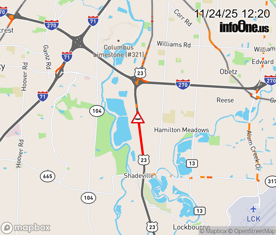 The right shoulder is blocked on US-23 North beyond London Groveport Rd, due to a crash. Updated: Mon 11/24/25 12:20 PM EST ![]() Updated: Mon 11/24/25 12:20 PM EST |