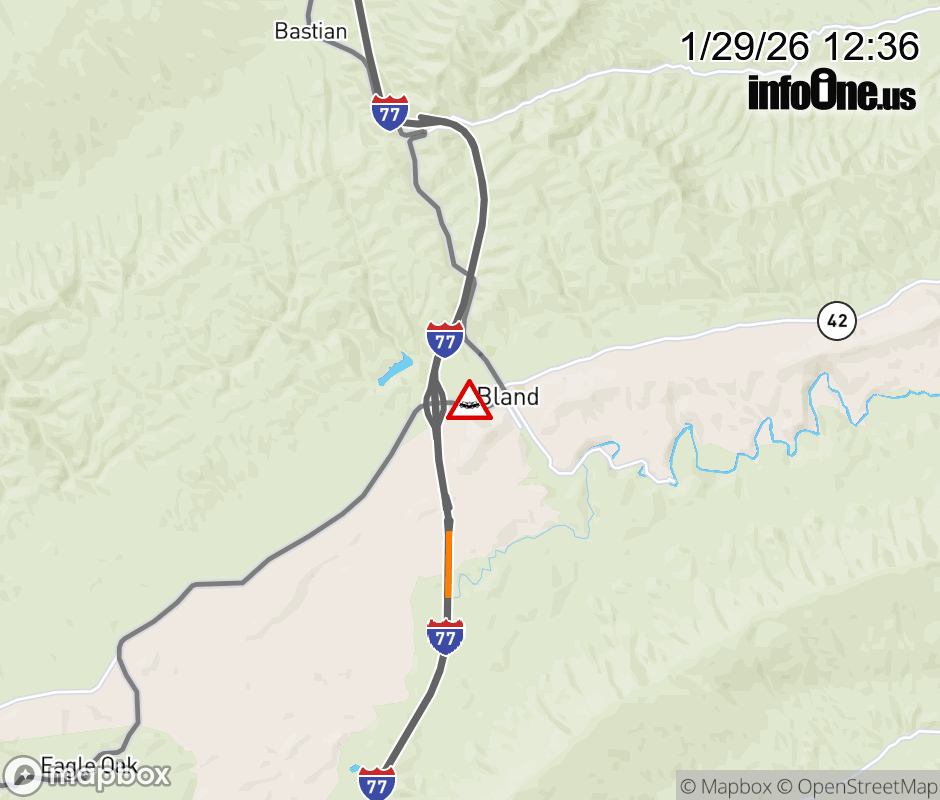 On Rt. 1005 East in the County of Bland, in the vicinity of S Scenic Hwy; US-52N/S, VA-42N/S, motorists can expect delays due to a vehicle crash. Lane closures exist. Updated: Thu 1/29/26 12:36 PM EST ![]() Updated: Thu 1/29/26 12:36 PM EST |