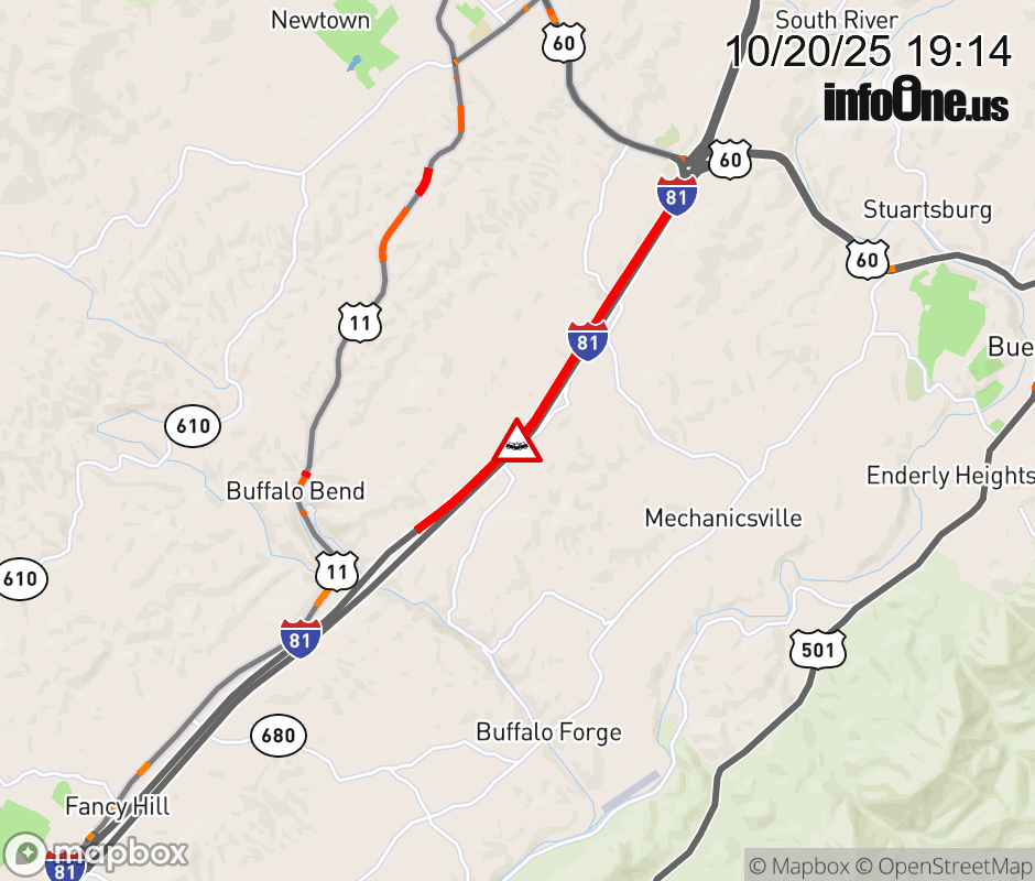 On I-81 South at mile marker 186 in the County of Rockbridge, motorists can expect delays due to a vehicle crash. Traffic backups are approximately 1.0 mile. Updated: Mon 10/20/25 7:14 PM EDT ![]() Updated: Mon 10/20/25 7:14 PM EDT |