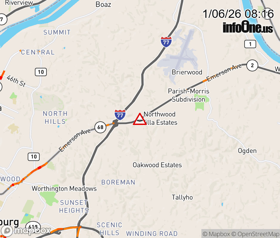 Vehicle Crash on WV-2 (Emerson Ave) & Wallace Rd in Parkersburg. Updated: Tue 1/6/26 8:16 AM EST ![]() Updated: Tue 1/6/26 8:16 AM EST |