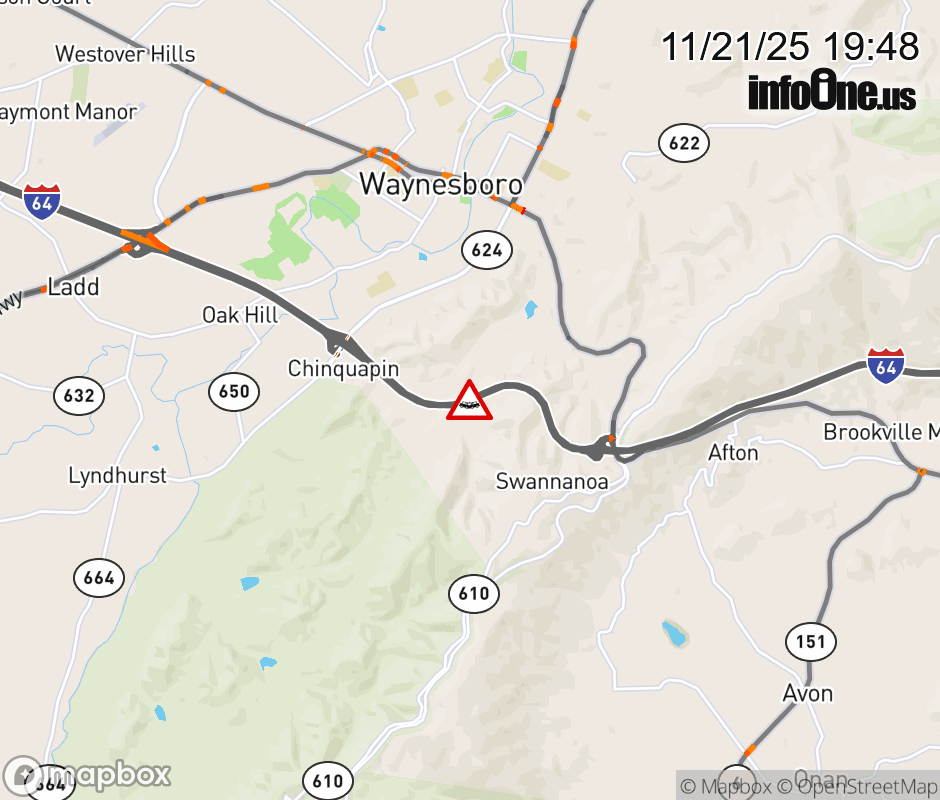 On I-64 at mile marker 98.2 in the County of Augusta, motorists can expect delays due to a vehicle crash. The east right lane and right shoulder are closed. Updated: Fri 11/21/25 7:48 PM EST ![]() |