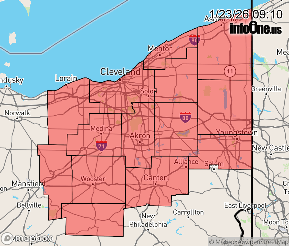 Canceled 1/23/26 1:24 PM Winter Storm Warning issued January 23 at 9:09AM EST until January 26 at 10:00AM EST by NWS Cleveland OH * WHAT... Heavy snow expected. Total snow accumulations between 7 and 10 inches. * WHERE... Portions of north central and northeast Ohio. * WHEN... From 7 PM Saturday to 10 AM EST Monday. * IMPACTS... Travel will be very difficult due to slippery road conditions and poor visibility. The hazardous conditions should impact the Monday morning commute. * ADDITIONAL DETAILS... Snow will spread into the region Saturday night and peak in intensity during the day Sunday. The snow will gradually taper off late Sunday night into Monday. Sub-zero wind chills are expected Saturday night into Sunday morning, and again Sunday night into Monday morning. ![]() |