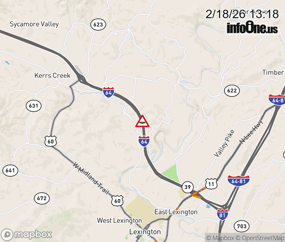 On I-64 at mile marker 53 in the County of Rockbridge, motorists can expect delays due to a vehicle crash. The west right shoulder is closed. Updated: Wed 2/18/26 1:18 PM EST ![]() Updated: Wed 2/18/26 1:18 PM EST |