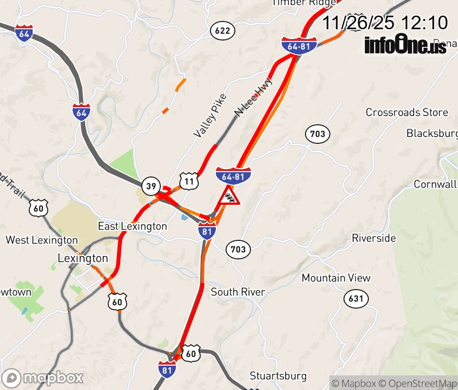 On I-81 North at mile marker 192 in the County of Rockbridge, motorists can expect delays due to congestion. Traffic backups are approximately 1.5 miles. ![]() |
