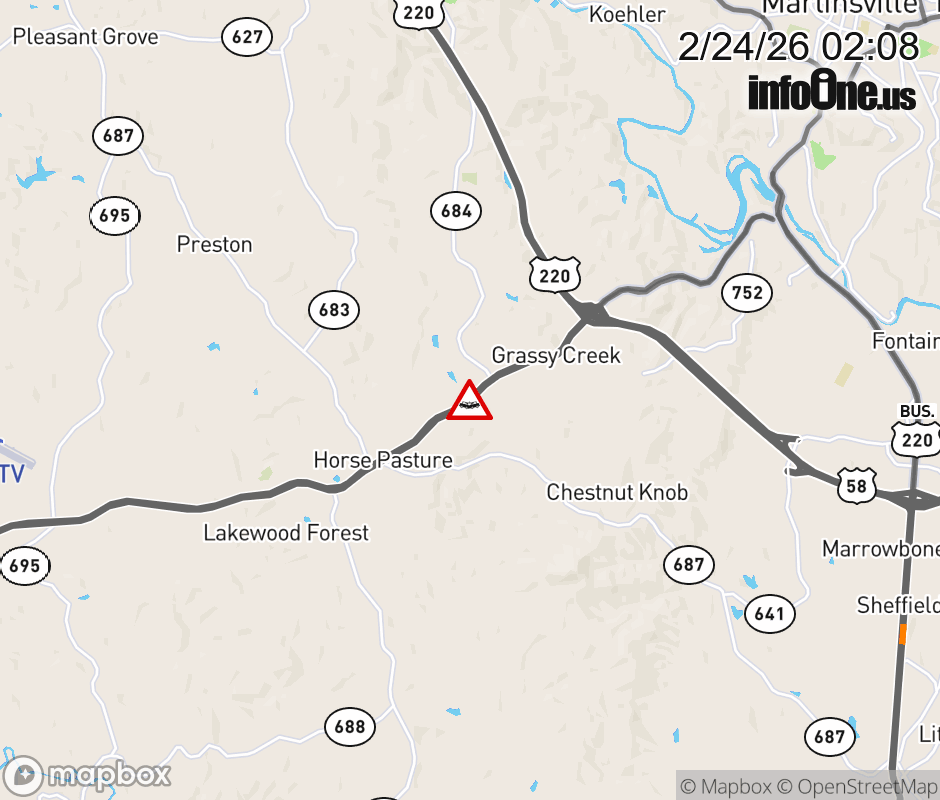 On US-58 West in the County of Henry, in the vicinity of Carver Rd; Rt. 684N/S (Henry County), motorists can expect delays due to a vehicle crash. Lane closures exist. ![]() |