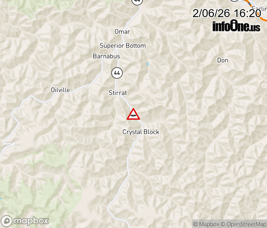 Vehicle Crash on WV-44 (11451 Jerry West Highway) . The northbound road is closed. The southbound road is closed. Updated: Fri 2/6/26 4:20 PM EST ![]() Updated: Fri 2/6/26 4:20 PM EST |