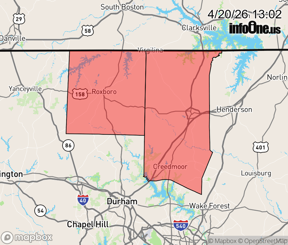 Canceled 4/20/26 10:40 PM Freeze Warning issued April 20 at 1:01PM EDT until April 21 at 8:00AM EDT by NWS Raleigh NC * WHAT... Sub-freezing temperatures as low as 29 expected. * WHERE... Granville and Person Counties. * WHEN... From 2 AM to 8 AM EDT Tuesday. * IMPACTS... Frost and freeze conditions could kill crops and other sensitive vegetation and possibly damage unprotected outdoor plumbing. ![]() |