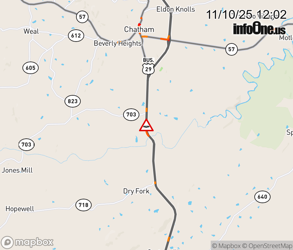 On US-29 North in the County of Pittsylvania, in the vicinity of Woodlawn Academy Rd; Rt. 1437N/S (Pittsylvania County), motorists can expect delays due to a vehicle crash. Lane closures exist. ![]() |