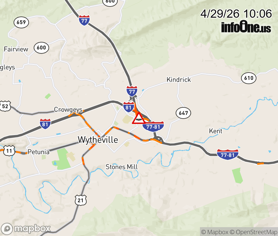 On I-77 at mile marker 40.9 in the County of Wythe, motorists can expect delays due to a tractor trailer crash. The south exit ramp narrows. Updated: Wed 4/29/26 10:06 AM EDT ![]() Updated: Wed 4/29/26 10:06 AM EDT |