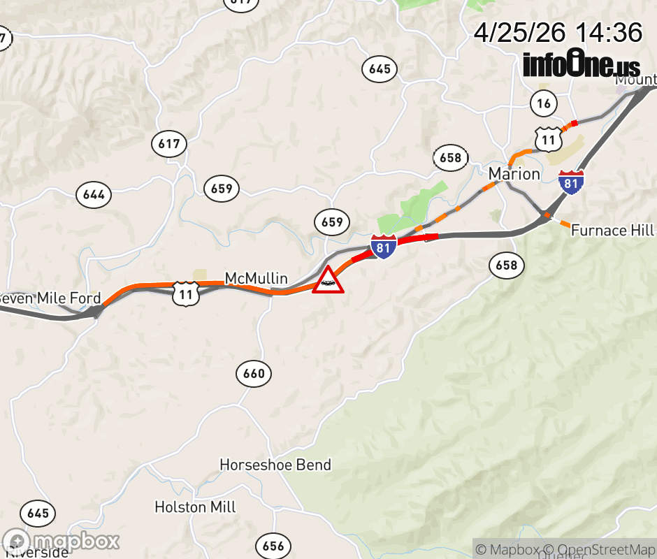 On I-81 at mile marker 42.6 in the County of Smyth, motorists can expect delays due to a vehicle crash. The south right shoulder is closed. Updated: Sat 4/25/26 2:36 PM EDT ![]() Updated: Sat 4/25/26 2:36 PM EDT |