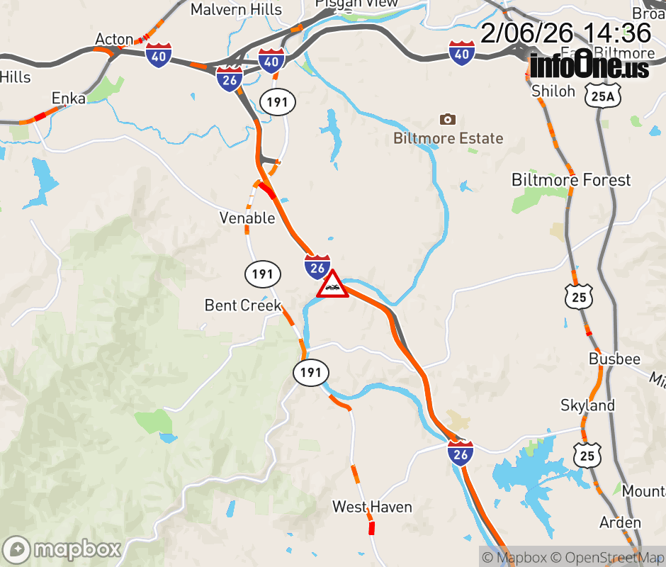 The right lane is closed 2 miles east of Exit 33, NC 191 (Brevard Road). Updated: Fri 2/6/26 2:36 PM EST ![]() Updated: Fri 2/6/26 2:36 PM EST |