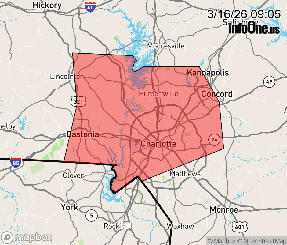 Canceled 3/16/26 9:48 AM Severe Thunderstorm Warning issued March 16 at 9:04AM EDT until March 16 at 10:00AM EDT by NWS Greenville-Spartanburg SC SVRGSP The National Weather Service in Greenville-Spartanburg has issued a * Severe Thunderstorm Warning for... Western Cabarrus County in the Piedmont of North Carolina... Eastern Lincoln County in the Piedmont of North Carolina... Mecklenburg County in the Piedmont of North Carolina... Gaston County in the Piedmont of North Carolina... * Until 1000 AM EDT. * At 904 AM EDT, severe thunderstorms were located along a line extending from 6 miles north of Lincolnton to 19 miles west of Huntersville to 6 miles southwest of Gastonia, moving east at 40 mph. HAZARD...60 mph wind gusts. SOURCE...Radar indicated. IMPACT...Expect damage to trees and power lines. * Locations impacted include... Gastonia, Uptown Charlotte, Huntersville, Downtown Concord, Central Charlotte, Northeast Charlotte, Southwest Charlotte, East Charlotte, Northwest Charlotte, and West Concord. ![]() |