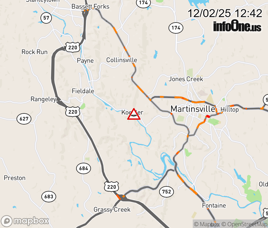 On VA-57 in the County of Henry, in the vicinity of Koehler Rd; Rt. 667E/W (Henry County), motorists can expect delays due to a vehicle crash. All east lanes are closed. All west lanes are closed. ![]() |
