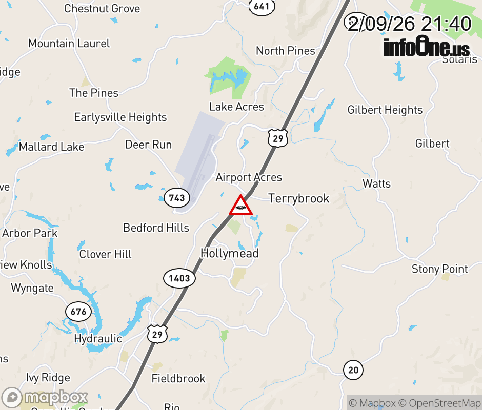On US-29 in the County of Albemarle, in the vicinity of Crossover; Timberwood Blvd; Rt. 1721N (Albemarle County); Rt. 1721N/S (Albemarle County); Rt. 1721S (Albemarle County), motorists can expect delays due to a vehicle crash. The north right outside lane and right shoulder are closed. ![]() |