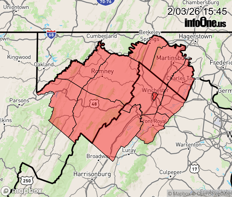 Canceled 2/3/26 10:00 PM Special Weather Statement issued February 3 at 3:44PM EST by NWS Baltimore MD/Washington DC * WHAT... Light snow likely. Total snow accumulations of a coating to 1 inch. * WHERE... Eastern West Virginia, the Potomac Highlands, and the northern Shenandoah Valley of Virginia. * WHEN... From 5 PM this evening to 1 AM EST Wednesday. * IMPACTS... Plan on slippery road conditions tonight into the Wednesday morning commute. ![]() |