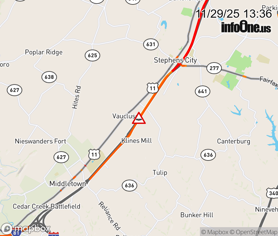 On I-81 South at mile marker 305 in the County of Frederick, motorists can expect delays due to a vehicle crash. Traffic backups are approximately 2.0 miles. Traffic backups on I-81 North are approximately 1.5 miles. Updated: Sat 11/29/25 1:36 PM EST ![]() Updated: Sat 11/29/25 1:36 PM EST |