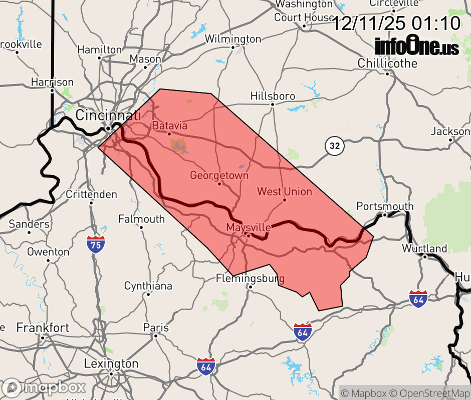 Canceled 12/11/25 2:45 AM Special Weather Statement issued December 11 at 1:09AM EST by NWS Wilmington OH At 108 AM EST, scattered snow showers were located along a line from Felicity, Ohio to near Maysville, Kentucky, moving southeast at 25 mph. HAZARD...Up to one inch of snow accumulation. SOURCE...Radar indicated. IMPACT...Slick roads are possible. Locations impacted include... Cincinnati, Covington, Independence, Fort Thomas, Newport, Loveland, Maysville, Edgewood, Alexandria, Fort Mitchell, Highland Heights, Milford, Taylor Mill, Fort Wright, Dayton, Georgetown, Southgate, Crestview Hills, Lakeside Park, and Claryville. Exercise extra caution while traveling. To report hazardous weather conditions, go to our website at weather.gov/iln and submit your report via social media, when you can do so safely. ![]() |