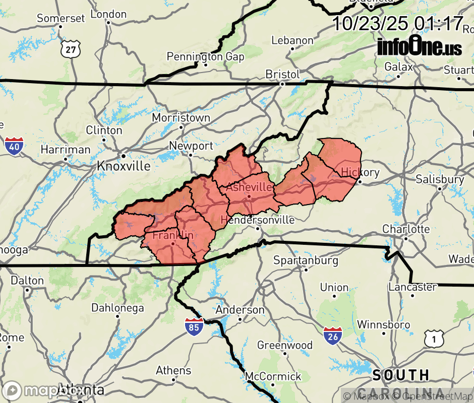 Canceled 10/23/25 10:13 AM Freeze Warning issued October 23 at 1:16AM EDT until October 24 at 9:00AM EDT by NWS Greenville-Spartanburg SC * WHAT... Sub-freezing temperatures as low as 29 expected. * WHERE... Buncombe, Burke Mountains, Caldwell Mountains, Graham, Haywood, Macon, Madison, McDowell Mountains, Northern Jackson, and Swain Counties. * WHEN... From 2 AM to 9 AM EDT Friday. * IMPACTS... Frost and freeze conditions could kill crops, other sensitive vegetation and possibly damage unprotected outdoor plumbing. ![]() |