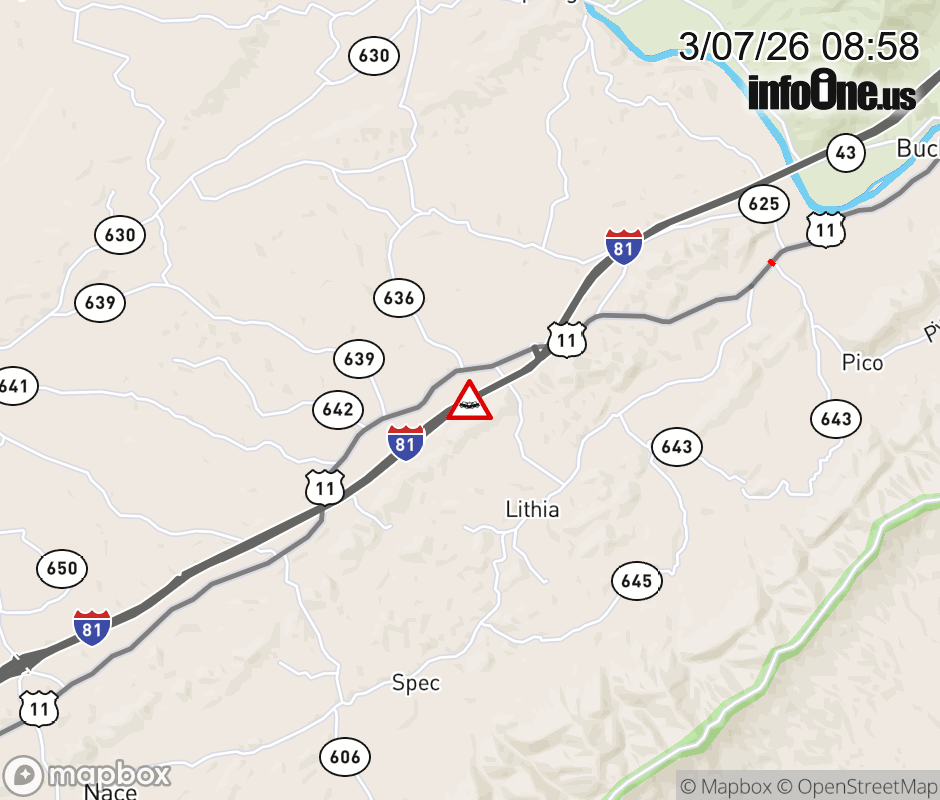 On I-81 at mile marker 161.3 in the County of Botetourt, motorists can expect delays due to a tractor trailer crash. The north right shoulder is closed. ![]() |