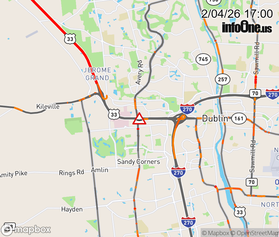 The left shoulder is blocked on US-33/SR-161 West beyond Avery - Muirfield Dr, due to a crash. ![]() |