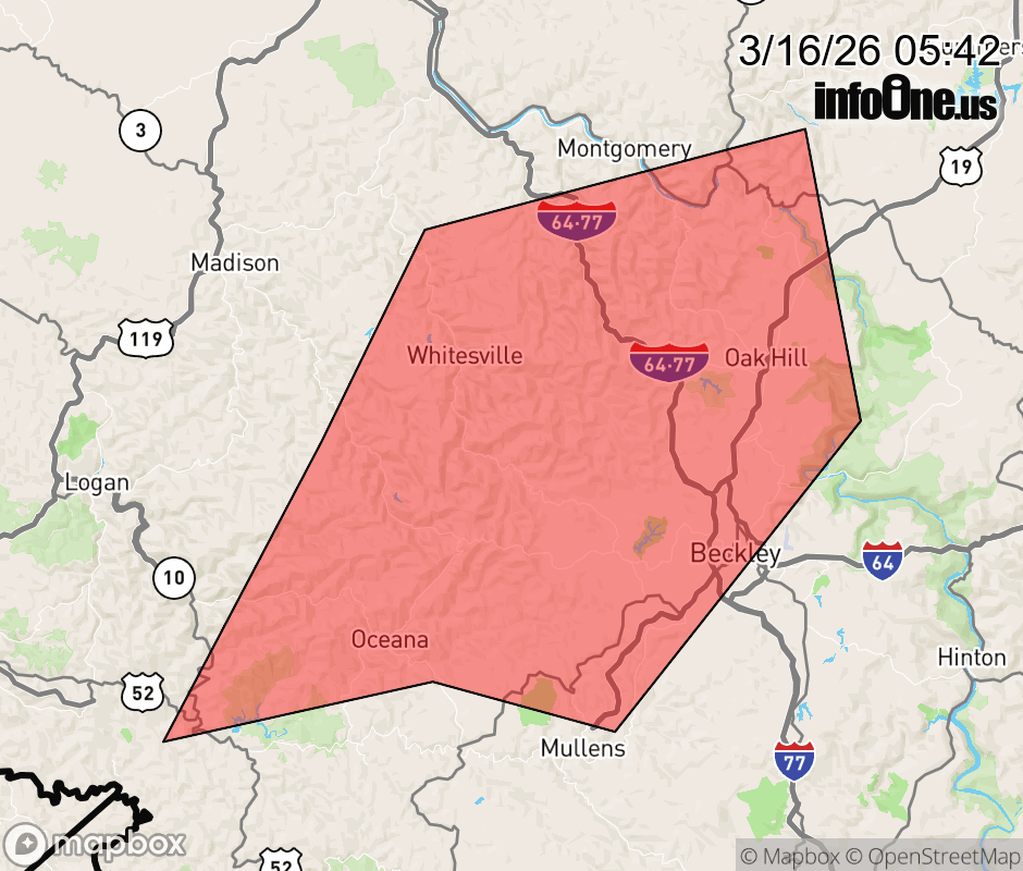 Canceled 3/16/26 6:00 AM Severe Thunderstorm Warning issued March 16 at 5:41AM EDT until March 16 at 6:30AM EDT by NWS Charleston WV SVRRLX The National Weather Service in Charleston West Virginia has issued a * Severe Thunderstorm Warning for... Southeastern Mingo County in southern West Virginia... Southeastern Kanawha County in central West Virginia... Western Raleigh County in southeastern West Virginia... Northern Wyoming County in southern West Virginia... Southeastern Logan County in southern West Virginia... Western Fayette County in southeastern West Virginia... Southeastern Boone County in central West Virginia... * Until 630 AM EDT. * At 541 AM EDT, severe thunderstorms were located along a line extending from 8 miles west of Burnwell to Bald Knob to near R.d. Bailey Lake, moving east at 35 mph. HAZARD...60 mph wind gusts. SOURCE...Radar indicated. IMPACT...Expect damage to roofs, siding, and trees. * Locations impacted include... Beckley, Fayetteville, Oak Hill, Mount Hope, Mabscott, Ansted, Oceana, Sophia, Gauley Bridge, Crab Orchard, Dry Creek, Macarthur, Bradley, Powellton, Hawks Nest State Park, Bald Knob, Piney View, Stanaford, Prosperity, and Amherstdale-Robinette. This includes the following highways... West Virginia Turnpike between mile markers 41 and 76. Route 19 between mile markers 1 and 20. ![]() |
