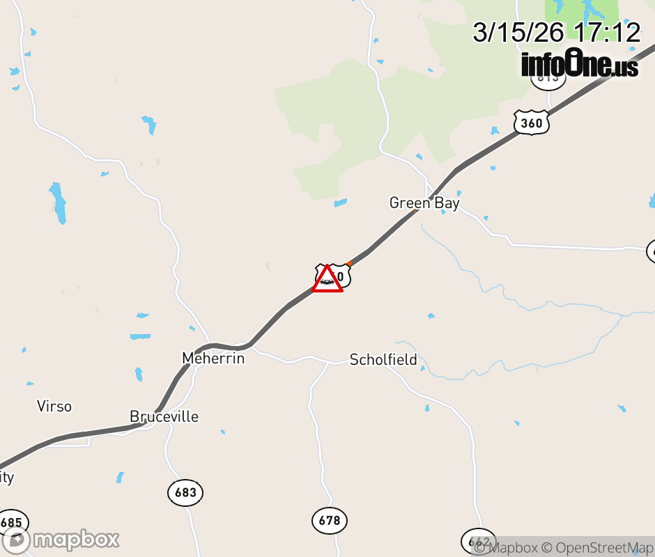 On US-360 West in the County of Prince Edward, in the vicinity of Mill Creek Rd; Rt. 628N/S (Prince Edward County), motorists can expect delays due to a vehicle crash. Lane closures exist. ![]() |