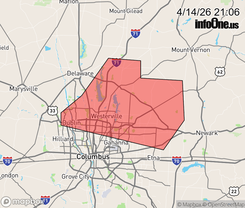 Canceled 4/14/26 9:16 PM Severe Thunderstorm Warning issued April 14 at 9:05PM EDT until April 14 at 9:30PM EDT by NWS Wilmington OH At 904 PM EDT, a severe thunderstorm was located over Polaris, moving east at 45 mph. HAZARD...60 mph wind gusts. SOURCE...Radar indicated. IMPACT...Expect damage to trees and power lines. Locations impacted include... Dublin, Westerville, Worthington, Pataskala, Powell, Johnstown, Sunbury, Minerva Park, Beechwood Trails, Polaris, Easton, New Albany, Jersey, Shawnee Hills, Galena, and Riverlea. This includes I-71 in Ohio between mile markers 116 and 138. ![]() |