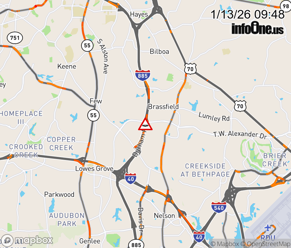 The left shoulder is closed at Exit 7 (TW Alexander Dr). Updated: Tue 1/13/26 9:48 AM EST ![]() Updated: Tue 1/13/26 9:48 AM EST |