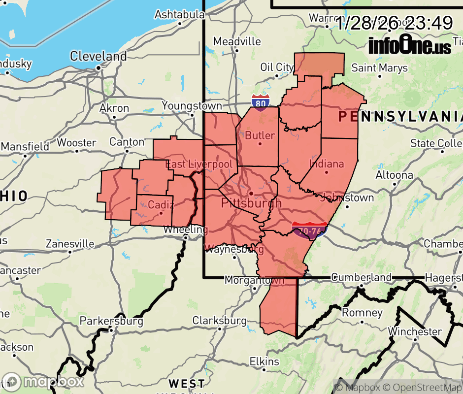 Canceled 1/29/26 10:53 AM Cold Weather Advisory issued January 28 at 11:48PM EST until January 30 at 11:00AM EST by NWS Pittsburgh PA * WHAT... For the first Cold Weather Advisory, very cold wind chills as low as 10 to 15 below zero. For the second Cold Weather Advisory, very cold temperatures as low as 5 to 15 below zero. * WHERE... Portions of east central Ohio, northwest, southwest, and western Pennsylvania, and northern and the northern panhandle of West Virginia. * WHEN... For the first Cold Weather Advisory, until 11 AM EST Thursday. For the second Cold Weather Advisory, from 7 PM Thursday to 11 AM EST Friday. * IMPACTS... The cold wind chills as low as 15 below zero could result in hypothermia or frostbite if precautions are not taken. Frostbite and hypothermia will occur if unprotected skin is exposed to these temperatures. An extended period of freezing temperatures could cause ruptured water pipes. ![]() |