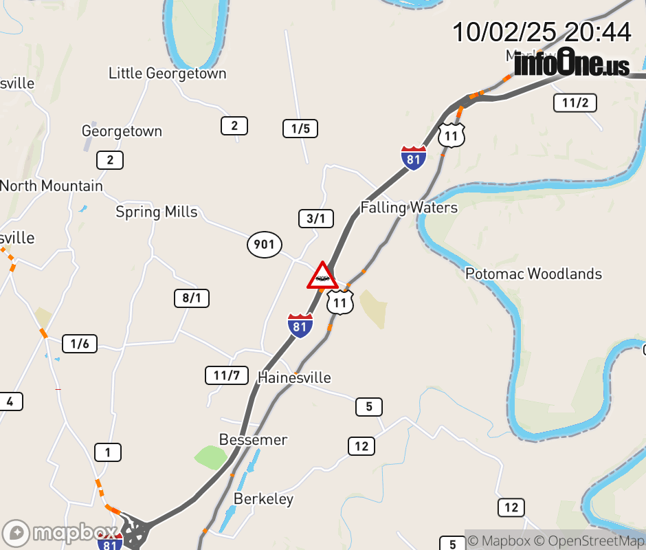 In Berkeley County there is a Vehicle Crash on WV-901 Hammonds Mill Rd/I-81. Opposite lanes impacted: ALL LANES. Updated: Thu 10/2/25 8:44 PM EDT ![]() Updated: Thu 10/2/25 8:44 PM EDT |