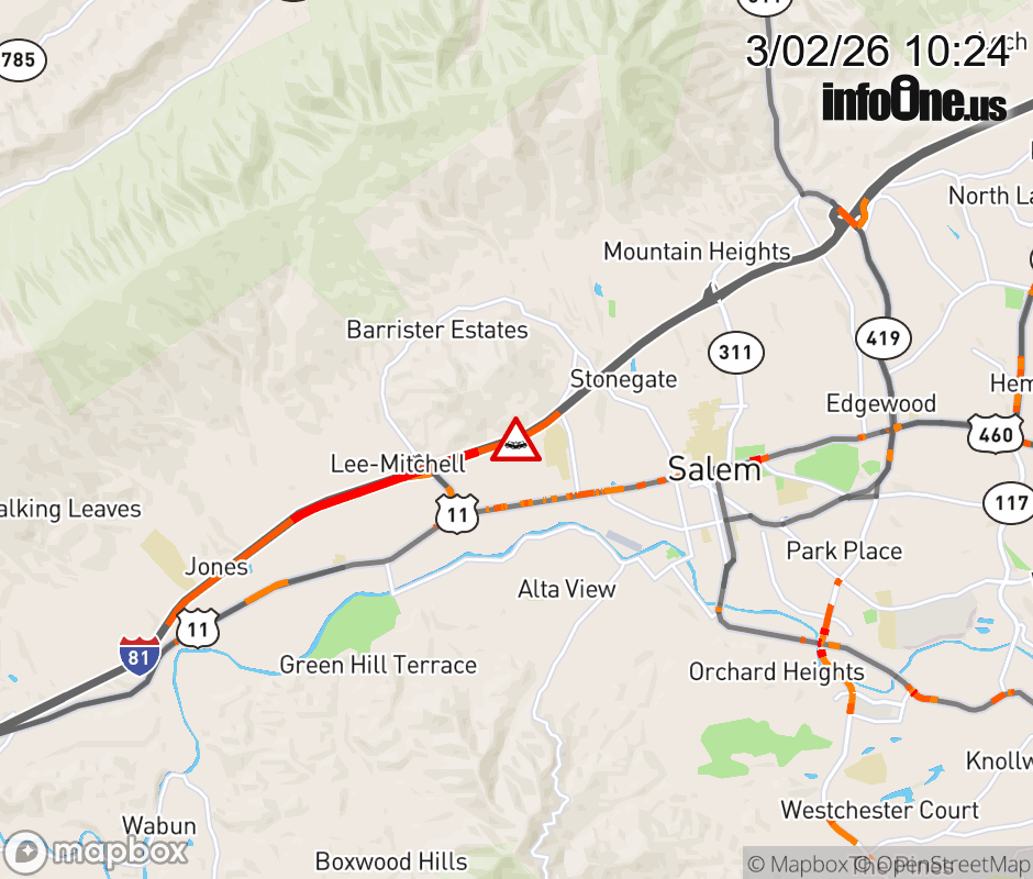 On I-81 North at mile marker 138 in the County of Roanoke, motorists can expect delays due to a tractor trailer crash. Traffic backups are approximately 1.0 mile. Updated: Mon 3/2/26 10:24 AM EST ![]() Updated: Mon 3/2/26 10:24 AM EST |