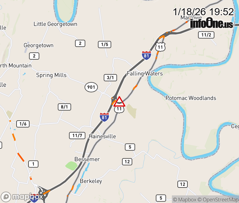 Vehicle Crash on WV-901 at Mile Marker 5.5. The eastbound road is closed. Updated: Sun 1/18/26 7:52 PM EST ![]() Updated: Sun 1/18/26 7:52 PM EST |