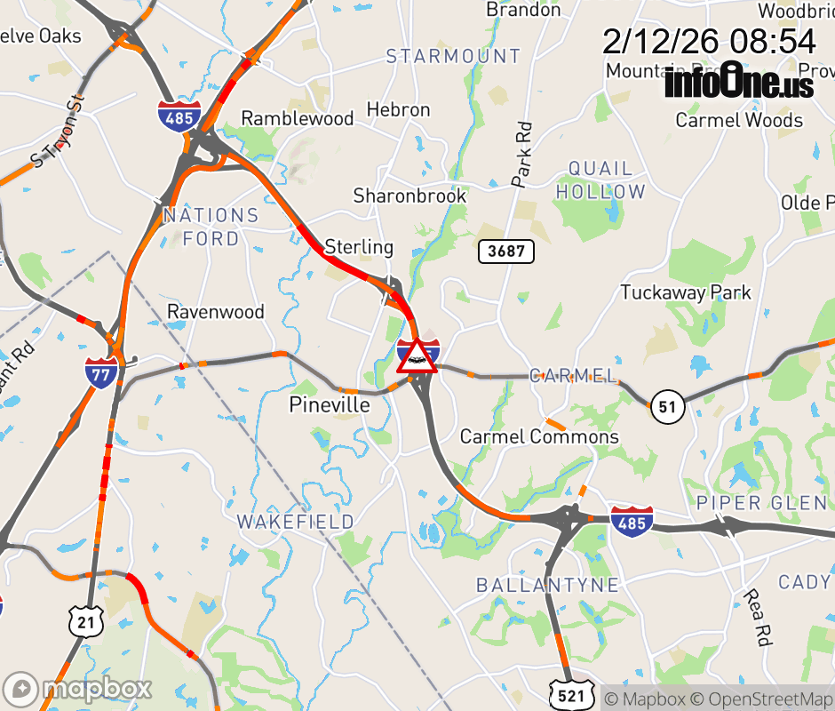 The three left lanes is closed at Exit 64 B (NC 51). Updated: Thu 2/12/26 8:54 AM EST ![]() Updated: Thu 2/12/26 8:54 AM EST |