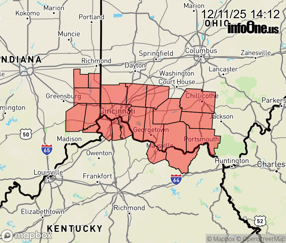 Canceled 12/11/25 2:23 PM Winter Weather Advisory issued December 11 at 2:11PM EST until December 12 at 10:00AM EST by NWS Wilmington OH * WHAT... Snow expected. Total snow accumulations between 1 and 3 inches. * WHERE... Portions of east central and southeast Indiana, northeast and northern Kentucky, and south central and southwest Ohio. * WHEN... From 7 PM this evening to 10 AM EST Friday. * IMPACTS... Travel could be very difficult. The hazardous conditions could impact the Thursday evening and Friday morning commutes. ![]() |