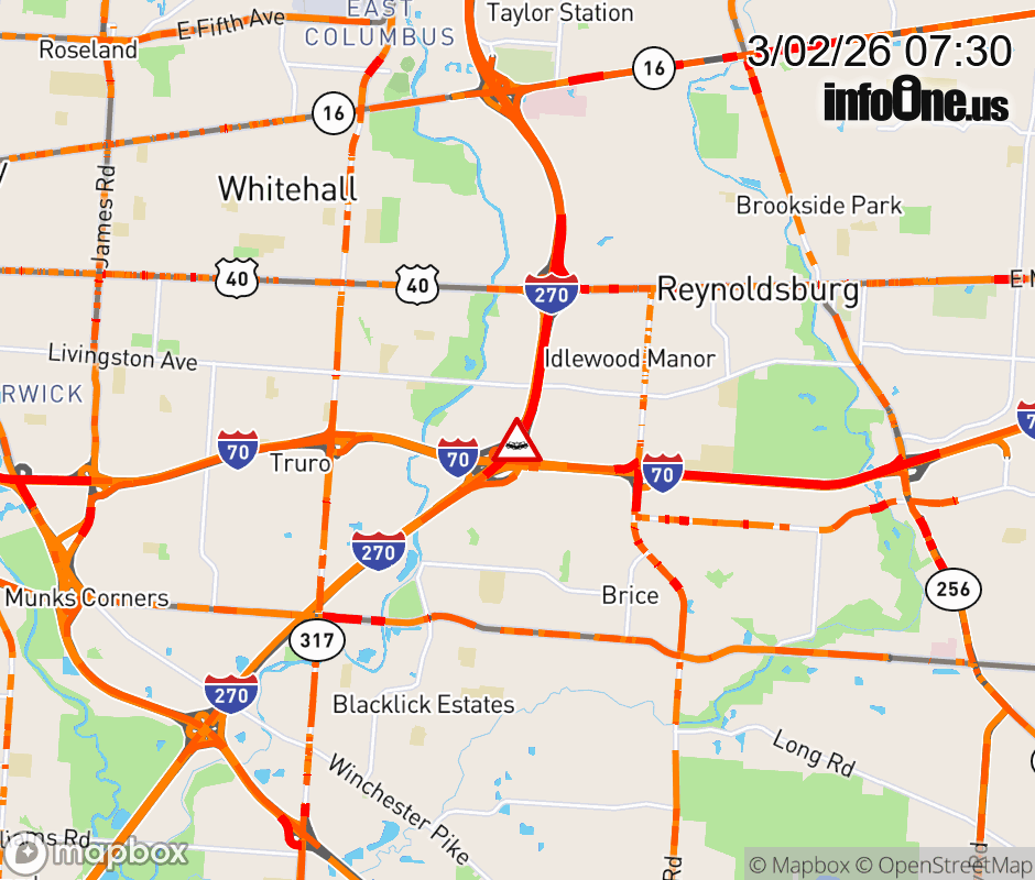 The left lane is blocked on I-270 North beyond I-70, due to a crash. Updated: Mon 3/2/26 7:30 AM EST ![]() Updated: Mon 3/2/26 7:30 AM EST |